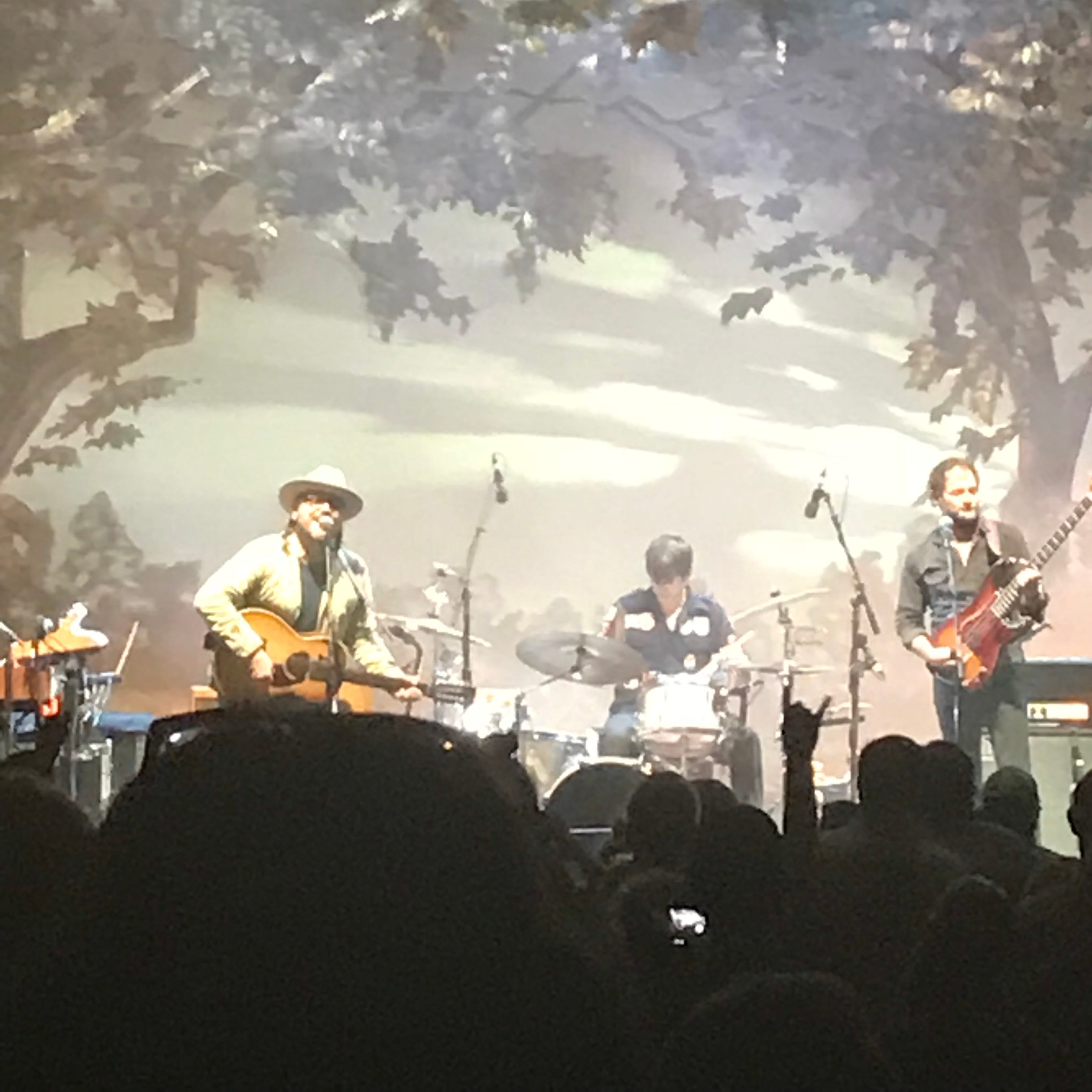 After a one-beat pause Glenn Kotche beat the drums solid into the tale of Choo Choo Charlie in "Monday," and I jumped harder, screamed louder through the song played with the bright urgency of a new adult getting out of town because he had better places to be, like the song's protagonist. With a manic flash of the stage lights against the dappled tree backdrop, the band didn't pause, going straight into "Outtasite (Outtamind)" with the same punk tempo. A triple-guitar melody sing-songing that I know you don't love me but you've still been thinking of me oh oh alright. And I jumped harder, faster, shaking my sweaty curls and scream-singing myself hoarse, bleeding out the toxins of two weeks of kitchen stress, two weeks of panic attacks over my cat's mystery illness and the 14-year-old stranger-child I'd birthed, pogoing through layers of exhaustion that had made me doze off in the big sunny window at Outerlands Coffee that afternoon. Bouncing over agony itself to yell, "Look out! Here I come again and I'm bringing my friends! Okay alright okay alright!" in this social group of beloved strangers in this big room while Pat Sansone strutted like Jagger, windmilled like Townsend, and John Stiratt leapt like Eddie Van Halen, the leaders of the cool kids who'd never been cool until we grew into our forties and fifties, ceased being able to give fucks about fitting in with anyone other than the other others, our soul mates who knew what it was like to be so misunderstood.