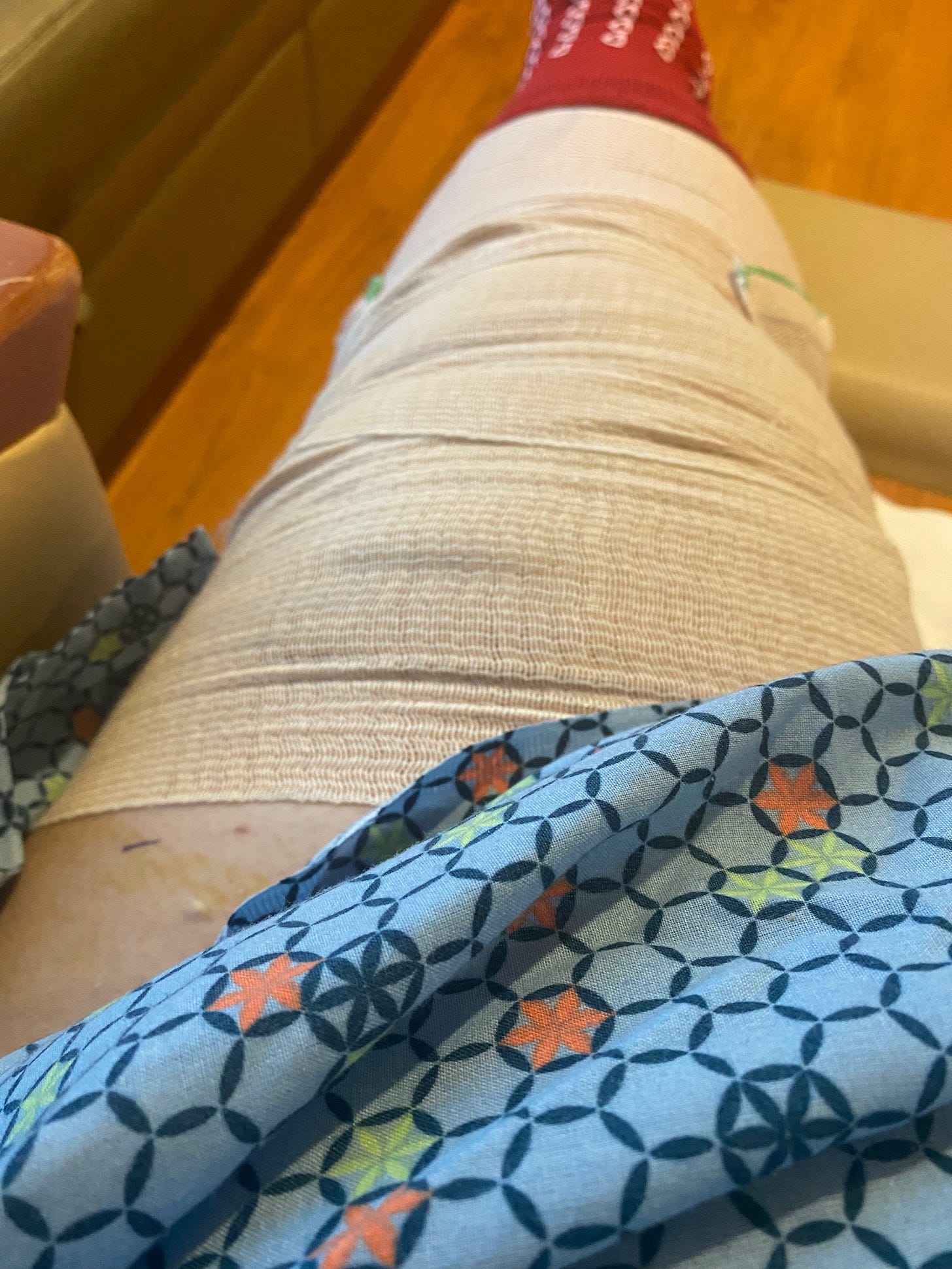 I think I need a little more time in this death cocoon. At least this week. Maybe the next. It’s a cocoon where I’m pumping my ankles, pressing my quadriceps, massaging shea butter into the raised zipper of my one exposed scar while the other scar finishes closing under a line of steristrips. Thirty-two staples in each knee, perfectly executed by one of the best orthopedic surgeons in the country. Soon enough they’ll be covered with tattoos of bouquets with flowing ribbons, as all folly turns to beauty. After I learn this current lesson in how to die to be alive.