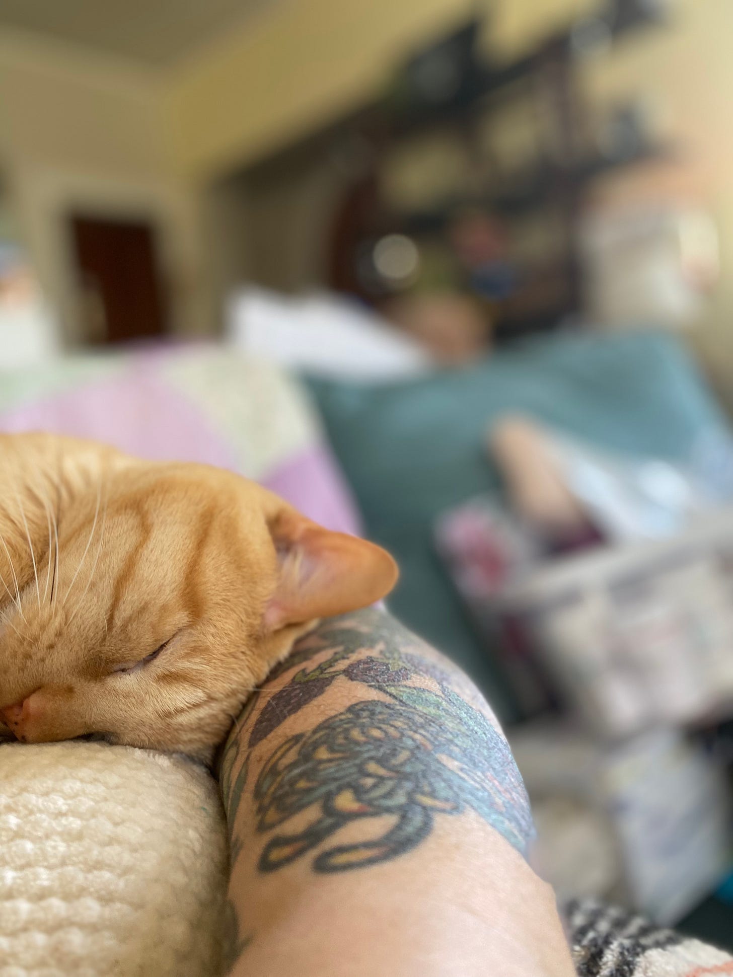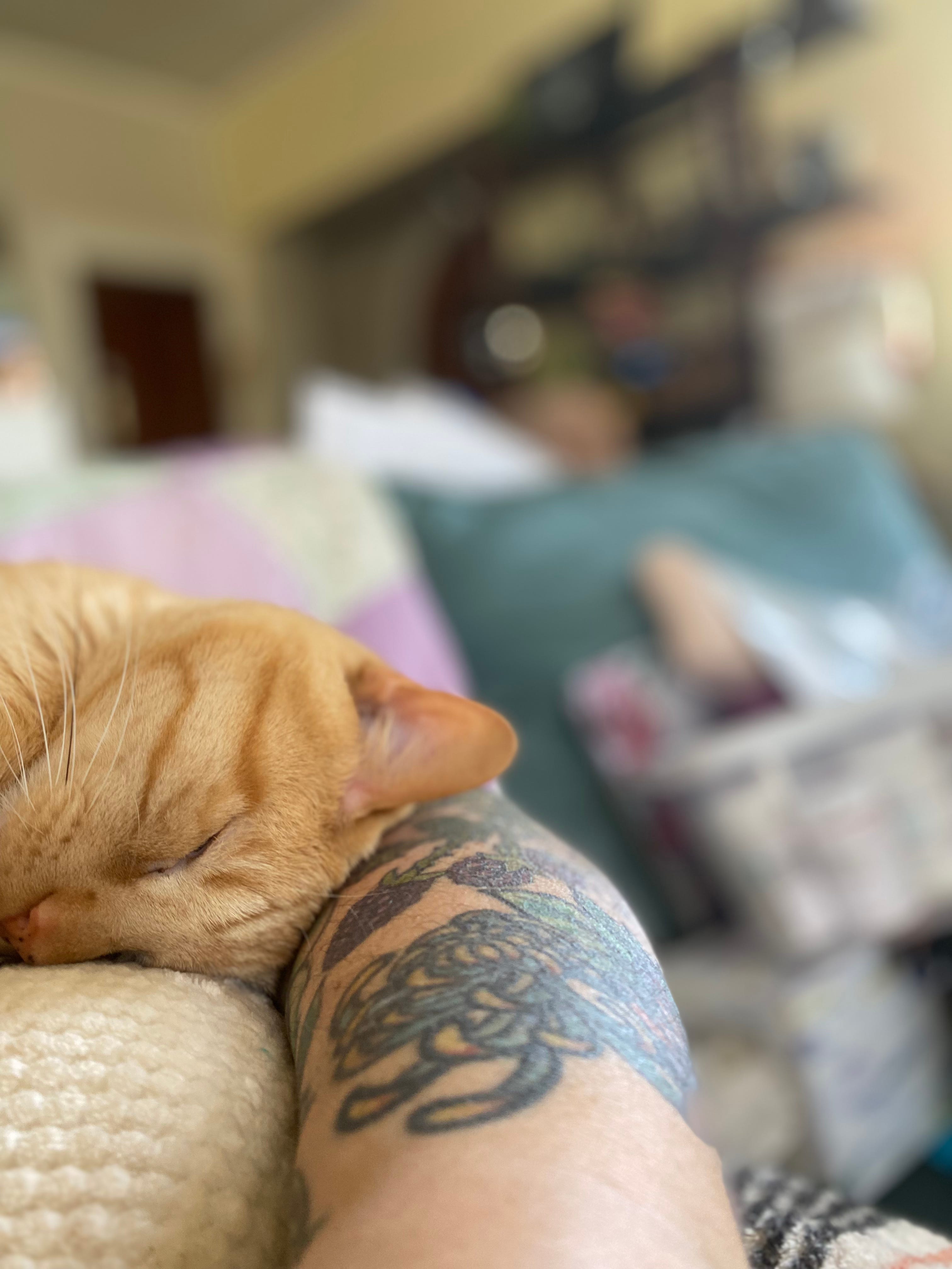 Woody snuggles on my chest several times a day and purrs in his sleep. He lulls me to sleep. Why would I want to do anything but this, forever? Some days it’s hard to find an answer to that question. I’m loathe to make him move.